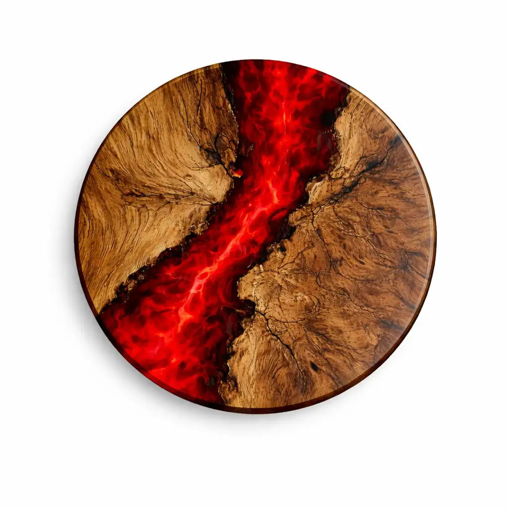 Wanduhr aus massivem Holz mit rot-amberfarbenem Epoxidharz – warm, ausdrucksstark und ruhig gestaltet.